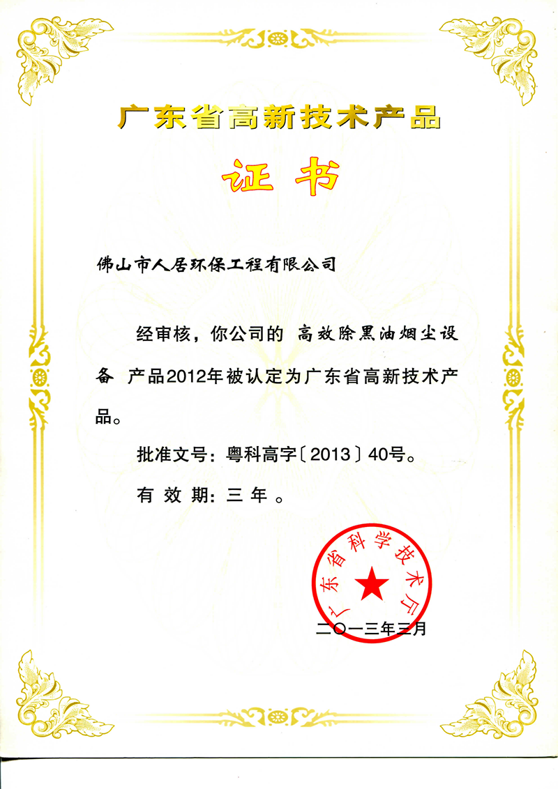 1 、高效除黑油烟尘设备高品证书 2 、介布二元除尘器高品证书